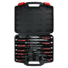 Profesjonalny zestaw 12 wkrętaków do pobijania umożliwia pracę z mocno dokręconymi lub zapieczonymi śrubami. Specjalna konstrukcja pozwala na uderzanie młotkiem w stalową stopkę, co zwiększa moment obrotowy i ułatwia odkręcanie.