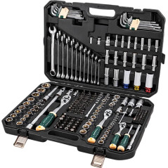 Komplet zawiera klucze kombinowane (12 szt.), klucze typu L TORX i HEX (18 szt.), śrubokręty oraz bogaty wybór bitów – ponad 100 końcówek w profilach HEX, SL, PH, PZ, TORX, TW, SP, TQ, TH, MN i S. Formaty 1/4", 5/16" i 3/8" zapewniają kompatybilność z narzędziami ręcznymi i elektronarzędziami.
