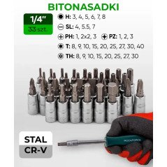 - Bity 1/4" x 25 mm (44 szt.): * H 3, 4, 5, 6 mm; HH 3, 4, 5, 6 mm; SL 4, 5.5, 6 mm; PH 1, 2; PZ 1, 2; M 5, 6, 8; TQ 6, 8, 10; TW 1, 2, 3; SP 4, 6, 8; TH 8, 10 (x2), 15 (x2), 20 (x2), 25 (x2), 40; T 8, 10, 15, 20, 25; S 1, 2