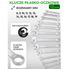 - Klucze płasko-oczkowe (12 szt.): 8, 9, 10, 11, 12, 14, 15, 16, 17, 18, 19 mm