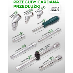 W zestawie znajdują się również pokrętła, przedłużki, przeguby kardana i adaptery, które umożliwiają wygodny dostęp do trudno dostępnych miejsc.