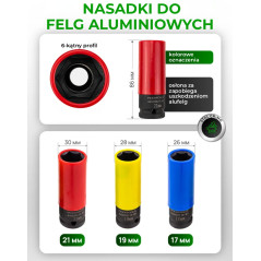 - Nasadki długie udarowe (do felg aluminiowych) (3 szt.): 17, 19, 21 mm