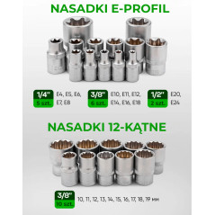 - Nasadki E-Torx (5 szt.): E4, E5, E6, E7, E8