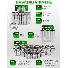 Nasadki 6 i 12-kątne, głębokie, typu E, udarowe oraz nasadki do świec 16, 18 i 21 mm zapewniają pełne pokrycie standardowych i specjalistycznych zastosowań.