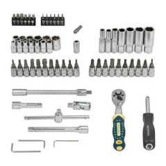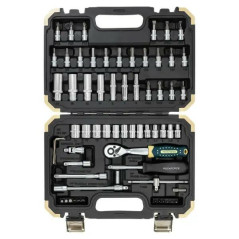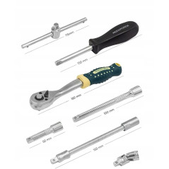 Grzechotka z mechanizmem rewersyjnym, pokrętło typu T, przegub kardana, przedłużki i uchwyt do bitów pozwalają na komfortową pracę nawet w trudno dostępnych miejscach.