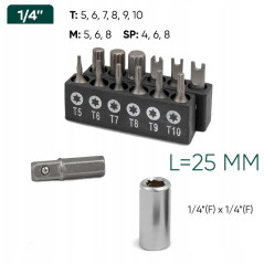 Zestaw zawiera 20 sześciokątnych nasadek 1/4" w zakresie 4–14 mm oraz bogaty wybór bitów.
